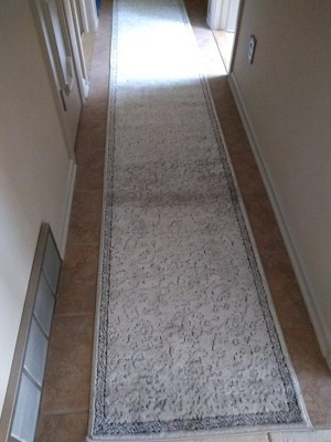 i love the rug. it does have a little pooling in one area (dark area where the fibers lay another direction) . If I lay it in the opposite direction, the shadows in the hallway make it almost unnoticeable. I have purchased many sizes in the Oregon ivory. It is a thin rug - this one is laying on tile and it doesn't really slip around (don't have a runner underneath). I only wish I could have gotten this one foot longer for my space.