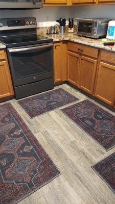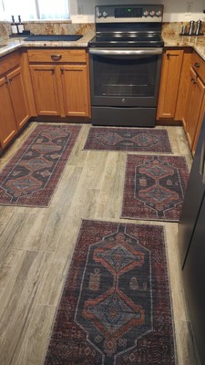 Bought three of these small 2 x 3 washable rugs for my kitchen along with a 2 x 5 runner. May be a bit overkill but I can always move and use them elsewhere. I haven't washed them yet but I hope they wash well when I do. I love the colors and with rugs pads under them they don't move around hardly at all. Unlike my other thicker rugs, these laid flat almost immediately. I like them a lot.