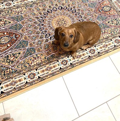 I got this rug a few weeks ago, and I can’t imagine life without it now. I got it for my kitchen because I needed a long enough rug to hold two dachshunds that follow me everywhere and sit at my feet. This works great and looks wonderful! The fringe isn’t too tempting for feisty dogs to mess with at all, and the rug flattened out after only one night, with a little help with some heavy objects. It doesn’t slide with the pad underneath and it’s very soft. But my favorite part of all is that the material does NOT fray & get my dogs paws caught in it. I only wish this rugs came in tons more color options! Highly recommend!