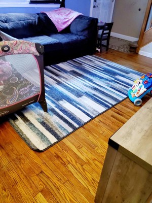 We purchased this rug for our living room after Christmas and adore it. We have 3 small children and a labrador. It's the perfect width and adds a touch of charm to our home. We are not a huge fan of shaggy thick carpets. Clean-up is extremely easy. You know how kids are! Crumb valley. Yes, you will see here that the corner is up but that is due to having a pack n play always shoved around! I highly recommend this rug :)