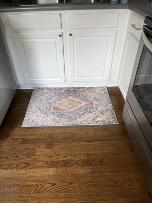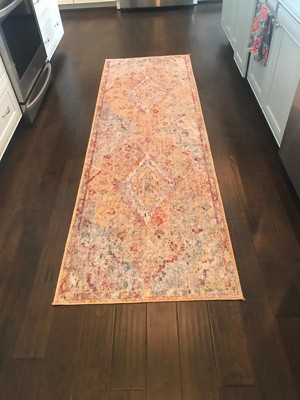 First, I was thrilled to be able to find just the right width rug, 2 ft 7 in, for a standard sized bathroom with a tub at one end to comfortably step out of the tub onto it. The rug goes up to the opposite wall all along the vanity, since it's a generous 8 ft 2 in long, making it so comfortable as I get makeup on and get dressed. There's about 2 in of space at each end of the rug which is perfect. The room angles to a separate area where it passes closets (for the toilet); I put the 2x3 matching rug there, so no more cold ceramic tile. The rug is so soft and soothing under my bare feet, yet the bathroom and closet doors go over easily even with the non-skid pad under. The rugs' gorgeous patterns and colors transformed my plain bathroom into a spa of comfort and beauty. The room is painted a very pale green, and although there's no green in the rug, it's so perfect together, fresh, clean and relaxing. The pattern looks like an ancient Persian rug with a faded blending of soft colors and rich red-orange throughout. I couldn't be more pleased. A bonus for me is that the colors go perfectly with a small, rich-colored tapestry I bought years ago in France for $250 which is the medieval scene of "The Bath" which I will be hanging in this bathroom. Thanks to rugs.com my bathroom is beautiful!