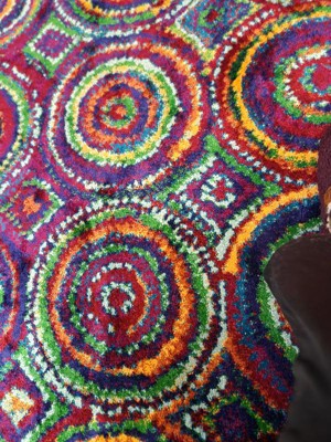 I bought this rug for a newly enclosed back porch. The oval rug fits the floor space pefectly, and the psychedelic colors and design contribute to a cozy gathering place. I love it!