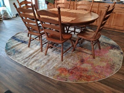 We had redone our kitchen which I love but it is on the darker side with cabinets and flooring. When I found this website I decided a rug would brighten up the kitchen. Perfect size under the table and chairs and plenty of room to sit on chairs without being half on half off the rug.