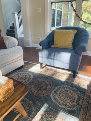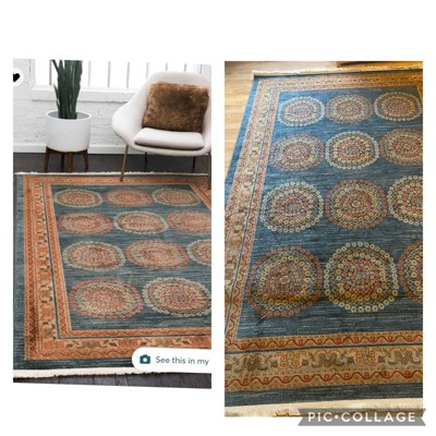 I am extremely disappointed by the color of this rug. It is completely different than the picture advertised. The picture shows a deeper, teal-ish color with accents of yellow/orange. The actual rug is a light gray blue with tan and red. Not at all what I was wanting.
