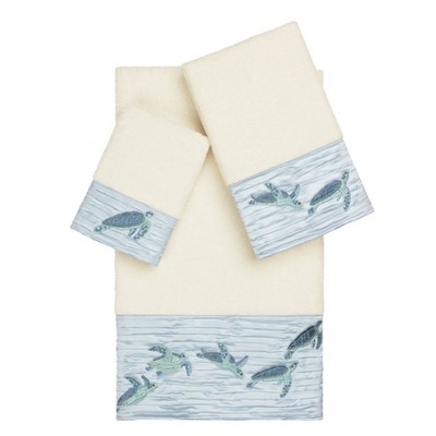 • A: These towels feature an embroidered seahorse motif on a pleated border for added elegance.