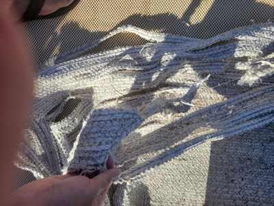 After having this for only a year, and placing it outdoors in an area where there was no foot traffic at all. (I planned to set up furniture there, but didn't get around to it). Once I finally was going to move it, it fell apart completely and the thin strands that hold the rope portion of the rug just completely disintegrated. The pictures are just from me picking up a corner, and movement at all, and the strands just come loose. This was a disaster.