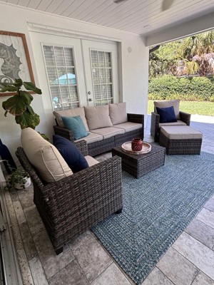 So happy with the Great Quality of this rug. We have dogs so needed a heavier outdoor rug! The color combo is just what I wanted for our back patio!