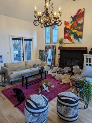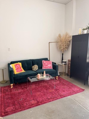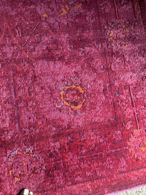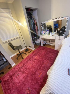 After looking at many different rugs, I finally chose and purchased this rug for my office last month. It is the perfect color, size, and design for my office, the quality is really nice, and the thickness perfect, as the room has wall to wall carpeting and this is perfect on top of it. I'm very pleased with this rug! The pink is perfect too, I love it.