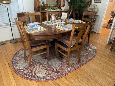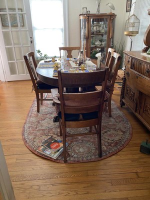 Very happy with the Lola oval rug. It is perfect shape and size for my oak oval dining table. It arrived in just a few days after ordering. Added the carpet pad underneath for extra cushioning and protection. The colors are true to the online picture. It helps to use the online feature to visualize the carpet in the room. One of the ends required placing books on it for a few days, which did the trick to flatten it.