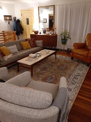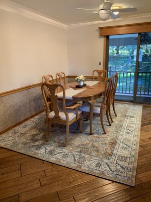 We bought our rug a couple of weeks ago and are quite pleased with how it looks and feels in the living room. We wanted something larger, lighter in color, plus soft under our feet without costing a small fortune. The mustard color is slightly more muted than expected, but it blends well with other colors in the room. The pattern is interesting without being overpowering. I love that the rug doesn't show dirt yet it is light enough to brighten up our rather dark space. Unfortunately, we didn't see the directions to unroll then re-roll in the opposite direction before moving heavy furniture and placing it, so some creases are still working themselves out. The creases are minimal and not enough to detract from the appearance or walkability. We used a felt-type rug pad that works well with our rug, giving it a soft, secure base. It's a great rug for a great price.