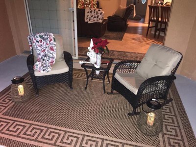 Absolutely love this rug. Exactly as described. Beautiful. Durable. Came on time. It was a wonderful addition to our patio. I would give this 10 stars if I could.
