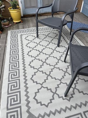 [This review was collected as part of a promotion.] I absolutely love this outdoor rug. It matches perfectly with my color scheme and brings in some much needed design. My deck is grey but the railing is white and the spindles are black and my furniture is greyish/brownish with black arms so this matches perfectly and ties everything together. I like that it's not super thick because when it does get wet, it dries out very quickly and seems to be holding up well to the intense heat of the south. It's the perfect size which covers the middle between my sofa and chairs and is just enough under the coffee table. Seems to be of decent quality but can't vouch (yet) for the quality. Will see after this season is over). I would definitely recommend this if you want a decent rug that looks high quality and will fit in with any color scheme.