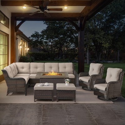 POCASSY 7-piece outdoor furniture set with fire pit table, brown wicker outdoor living set with patio sectional sofa, swivel chair