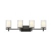 Bring an updated contemporary vibe with layering and linear elements, choosing this four-light bath vanity light. Intricate detail is textural and artisan with clear glasswork in a cylinder shape, with an inner white diffuser. Etched opal and clear glass blend as they enhance cool brushed nickel finish framing and show off a crisp mix of circles and lines.