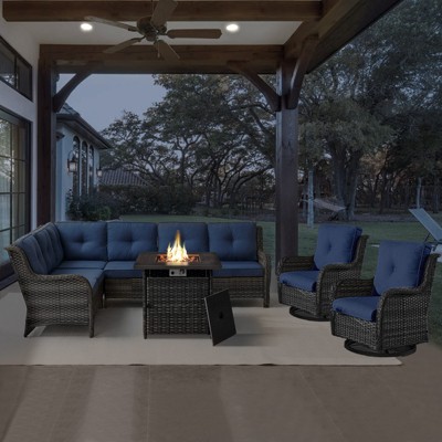 Features: Firepit Lava Rocks, Swivel-Motion Chairs, Removable Cushions