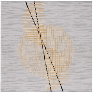 Enhance your living space with our exclusive modern-style area rug, sized at a perfectly square 6 feet 7 inches by 6 feet 7 inches. Crafted meticulously in Turkey using a power-loomed technique, this rug boasts a durable and easy-to-care-for polyester construction, ideal for everyday use. The rug features a stunning combination of grey and gold colors, presenting a sophisticated palette that will complement a variety of decor settings. The bold pattern showcases an abstract design, reminiscent of linear art, adding a touch of elegance and visual interest to your room. With a low pile height of 1/4 inch, it provides a sleek profile and is suitable for areas with high foot traffic, without sacrificing comfort. Its square shape makes it a versatile addition to any space, whether placed under a coffee table, used as a statement piece in your living area, or anchoring a dining room setup. Experience a blend of contemporary design and exceptional craftsmanship with this made-in-Turkey area rug that promises to elevate the aesthetics of your home while offering lasting beauty and luxury.