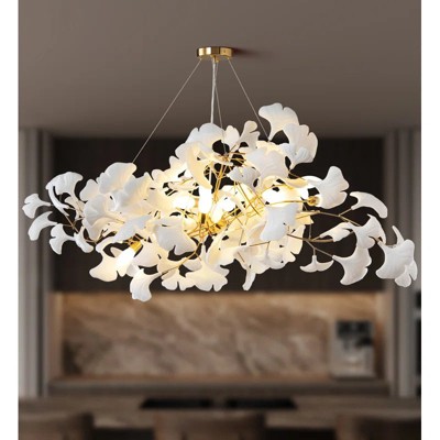Introducing the exquisite Ginkgo Leaf Dining Room Chandelier, a clever fusion of iron and ceramic with a sophisticated electroplated finish. This chandelier exudes luxury and sophistication, elevating your dining environment to unparalleled heights. It features ten carefully designed G9 bulbs that bring a warm 3000K glow to your space, perfectly creating an atmosphere that helps create an extraordinary dining experience.