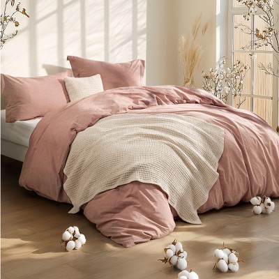 This 5-piece bedding set combines luxury and functionality, featuring a 100% pre-washed cotton exterior that offers a soft, breathable, and moisture-absorbing feel, along with a naturally wrinkled aesthetic. The throw blanket and pillow cover, made from a blend of 50% bamboo-derived viscose and 50% cotton, provide excellent breathability and moisture-wicking properties, ideal for hot sleepers. The comforter, filled with fine down alternative fiber, delivers cloud-like comfort suitable for year-round use, being lightweight in summer and warm in winter. Versatile enough to enhance any room, the set's stylish blanket can be used on beds, sofas, or elsewhere, making it a perfect gift for all ages and occasions. OEKO-TEX Standard 100 certified for safety, it's easy to maintain with a simple cold, gentle machine wash, and comes complete with everything needed to create a cozy, inviting sleep space for ultimate comfort in every season.