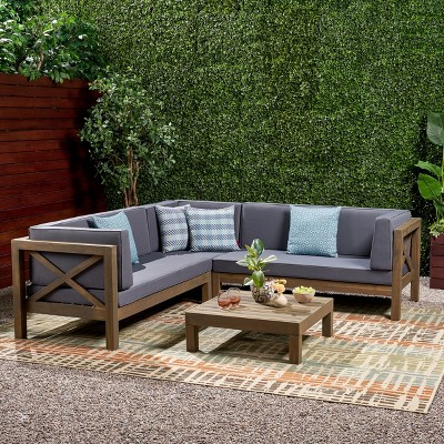 Christopher Knight Home Norfolk Outdoor Mesh and Wood 5 Seater Aluminum Sectional Sofa Chat Set with Cushions, Natural Brown/Gray