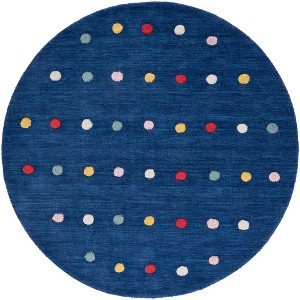 Introduce a burst of color and whimsy into any child's room with our 3' x 3' round area rug. With its rich navy hue as a backdrop, this hand-loomed delight, crafted with a durable blend of 70% wool, 20% latex, and 10% cotton, offers both comfort and playful style. The charming pattern sprinkles rows of multicolored dots across the surface, inviting eyes and little feet to enjoy its plush 3/8" pile height.
