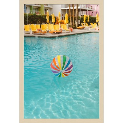 A colorful beach ball floats in a clear blue pool, reflecting the vibrant hues of a sunny day. In the background, there are rows of bright yellow lounge chairs and umbrellas, creating a cheerful and inviting atmosphere. The scene captures the essence of a relaxing summer holiday. This canvas art print was created by Bethany Young and printed in Waunakee, WI. It is stretched across a solid surface to resist sagging. We use only premium, high-tension canvas. Our exclusive stretching techniques hide corner folds and provide a taut canvas surface. The artwork is authentically licensed. The canvas appears as if it is floating in the frame because it has a narrow gap between the edge of the canvas and the frame. Our canvas items are individually made using traditional custom framing techniques, it has the quality you would expect from your local frame shop.
