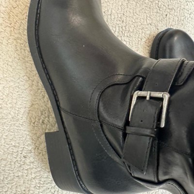 I had high hopes for these boots, but the height was a letdown. They’re listed as “knee-high,” yet on me (I’m 5’7”) they hit mid- to (maybe) upper- calf. They’d honestly need another three + inches to be considered knee high boots and that mislabeling is frustrating. That said, there are things I like. The back gusset has a lot of stretch which makes them easy to wear with bare legs and a dress, or jeans, leggings or tights. The side buckles also allow for some adjustment which is great if your legs can fluctuate in size. Sizing wise, I’m usually between an 8 1/2 and 9. I ordered the nine and they feel snug on my foot — I’d recommend ordering on the larger end of your size range. I also noticed my feet and legs got pretty sweaty so breatheability isn’t great. Overall, these could’ve been a solid option but the inaccurate knee-high description really knocked the rating down for me. If you’re looking for a calf boot with stretch, they may work just don’t expect them to reach your knee.