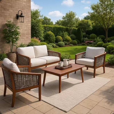 4-Piece Acacia Wood Outdoor Conversation Set in Brown - Teamson Home: Seats with Cushions & Matching Coffee Table