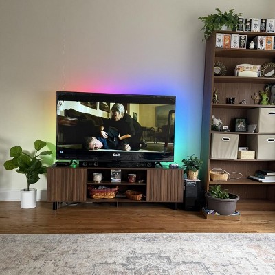 Skyzoo Walnut TV Stand with Mount combines style and functionality for your living room. Featuring a rich walnut finish with elegant fluted detailing, this TV stand with mount offers 40° swivel and height adjustment for optimal viewing angles. Enjoy built-in power with 2 outlets and 2 USB ports to charge your devices. The height-adjustable shelf system includes a three-position middle shelf and removable side shelves for customizable storage. Ample storage space includes deep side compartments and a central cabinet. Hidden cable management keeps wires organized. Durable craftsmanship enhances your home’s aesthetic.