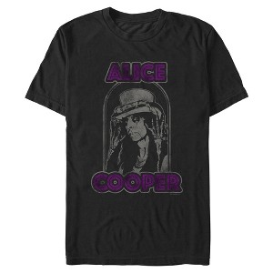 • Put some eyeliner on your wardrobe with this new men's t-shirt! Featuring a distressed portrait of Alice Cooper donning his iconic hat and skeleton gloves, with his name printed in bold purple letters across the front.