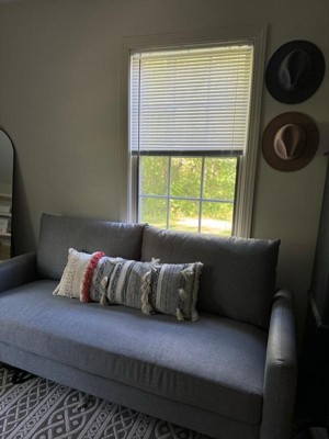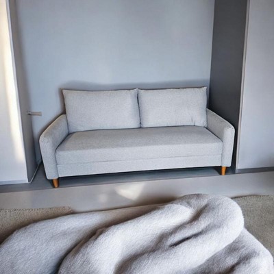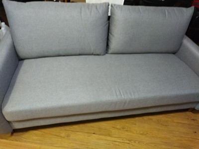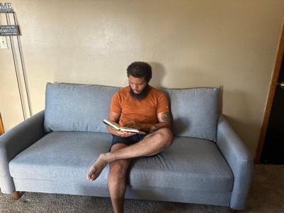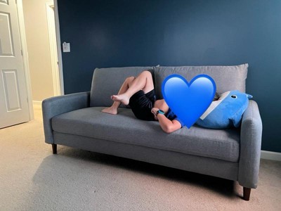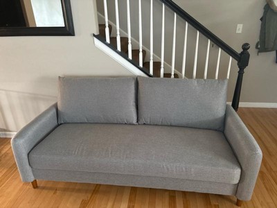 [This review was collected as part of a promotion.] It’s a modern design with firm cushions that are still comfortable. It comes in a light grey fabric that’s lint resistant and easy to care for. The assembly was pretty easy. All you need to do is tilt the arm rests at a slight angle and slide them onto the couch. Underneath the couch is storage for the back cushions and all you need to do is undo the velcro and remove them. You also need to screw in the legs of the couch. There are nonslip pads under the legs of the couch to keep your seat in place. It has a real eucalyptus wood frame and legs for sturdy support and a refined look.