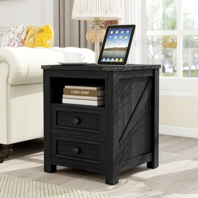 Versatile End Table with Charging Station - This 18"L x 18"W x 24"H side table doubles as a nightstand, featuring two drawers and an open shelf for storage. Includes a 6.5ft power cord with 2 AC outlets, 2 USB ports (1 PD USB-C), and a cord management hole for easy charging. Made of sturdy engineered wood with a waterproof top, it supports up to 110 lbs. Modern farmhouse design with metal handles, available in two colors. Simple assembly with labeled parts (approx. 30 mins).