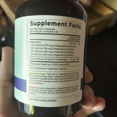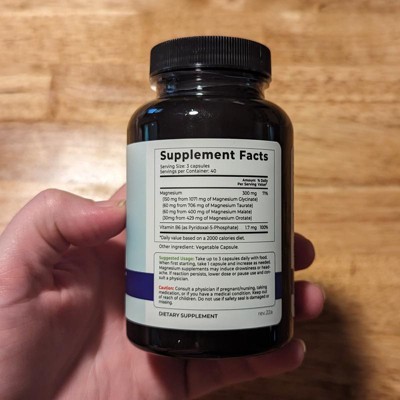 I like that this magnesium is a combo and that they incorporate B6. The pills are fairly large and the serving size is 3, although they tell you to work up to that number. It does not have a discernible aftertaste. The bottle is fairly small, but does contain 40 servings of 3 pills, which may be more than an individual needs. The pills are pretty chalky appearing/dusty on the outside. I received an incentive to write this review.