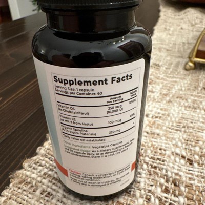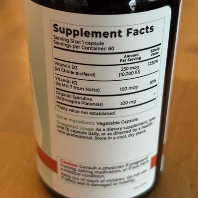 I'm impressed with this Vitamin D3 + K2 supplement. The 10,000 IU of D3 paired with 100 mcg of MK-7 feels like the perfect combo for bone, immune, and heart health. I love that it's organic, made without fillers, and even includes 320 mcg of spirulina for an extra nutrient boost. The vegetable capsule is easy to swallow and has no weird taste, which I was worried about with the spirulina. This formula feels clean, effective, and thoughtfully made. I'll keep this as part of my daily routine while I'm treating my vitamin D deficiency. 10,000 IU is a very high dose, so after I've treated my deficiency I will probably find another option. I received an incentive to write this review.