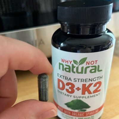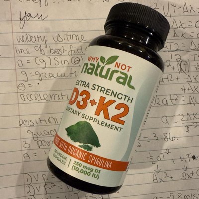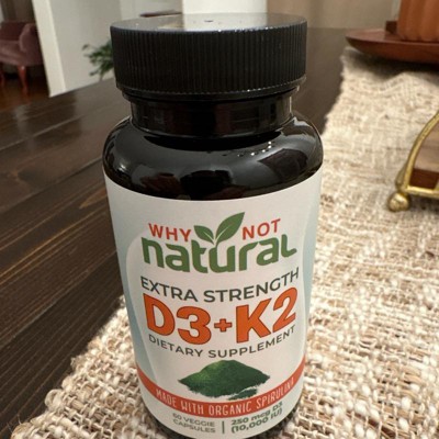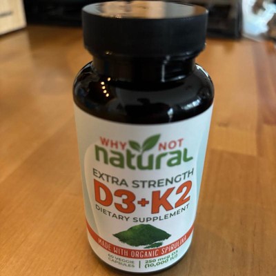 Another quality product from Why Not Natural! The combination of vitamins d3 and k2 are awesome together, and with the added benefits that spirulina can add as an antioxidant these supplements have an extra boost. Just one capsule gives you 10,000 iu of d3 and 100mcg of k2 which is an ideal dose for an adult. The spirulina has many extra benefits so this combo packs a punch in a small dose. The vegetation friendly capsules and organic ingredients are an added bonus. I received an incentive to write this review.