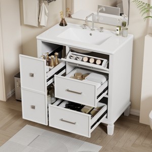 Upgrade your bathroom with this elegant freestanding vanity that combines timeless design with practical functionality. Featuring a high-quality ceramic sink and a robust structure made from MDF and solid rubber wood, this vanity ensures long-lasting durability. The standout flip-out drawer beneath the sink adds a touch of innovation¡ªperfect for storing frequently used items while keeping your space neat and organized. Soft-close doors and drawers enhance the user experience with smooth, quiet operation. With its ample storage capacity, sliver metal handles, and a sleek painted finish, this vanity blends beauty and utility, making it a stylish centerpiece for any modern bathroom.