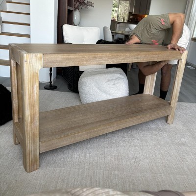 Color is nothing like advertised. The legs also look like they came from a different table compared to the top table and shelf of the console. Very surprised this is the finish quality they shipped out compared to what the table is advertised to look like. Will be returning. A real shame because the shape and size of the table is perfect.