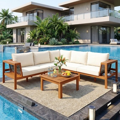 4-Piece Outdoor Acacia Wood Sofa Set with Woven Mesh Armrests, L-Shaped Patio Conversation Set with Coffee Table and Side Table, Beige - ModernLuxe