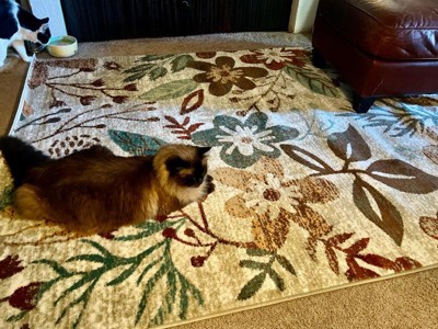 [This review was collected as part of a promotion.] This is a cheerful 5x7 rug that is obviously Mochi’s favorite! It’s casual, seems durable and well made. It will need a carpet pad on the hard wood but will be a cute addition to my office.