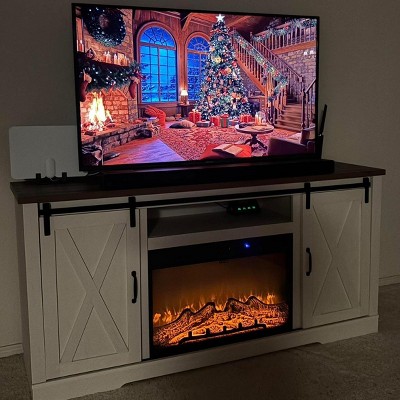 Introducing the Amerlife Farmhouse TV Stand with Fireplace, a versatile and stylish addition to your home.The sliding barn door not only adds a touch of elegance but also allows for easy access to your stored items. Inside, wire holes are strategically placed to keep your cables organized and out of sight.The adjustable feet and shelves provide flexibility in arranging your items, ensuring a perfect fit for your storage needs.