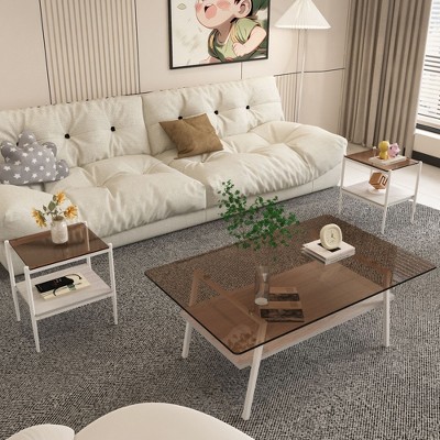 Product Name: Sapphtopaz 3 Piece Coffee Table Set Center Dining Table with Tempered Glass Tabletop and 2-Layer Storage Rack for Living Room, Apartment, White+Gray