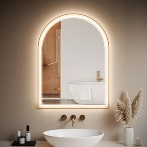 Arched LED Bathroom Mirror,Gold Bathroom Mirror with 3 Colors Lights, Anti-Fog, DimmableElevate your bathroom decor with this Arched LED Bathroom Mirror, combining modern elegance and cutting-edge functionality. Crafted with a premium gold aluminum frame, this mirror exudes sophistication while offering durability and shatterproof safety. Its sleek arched design adds a luxurious touch to any space, making it a standout centerpiece for contemporary or traditional bathrooms.Designed for versatility, the mirror features three adjustable color temperatures (cool white at 6000K, natural at 4500K, and warm at 3000K) to suit your mood or task. The user-friendly 3-button control panel allows effortless switching between lighting modes. Customize brightness by holding the ON/OFF button, ensuring ideal illumination for grooming or relaxation. The one-touch anti-fog function activates a defogging feature that clears condensation within seconds, automatically shutting off after one hour for safety and energy efficiency.Powered by ultra-bright, waterproof LED strips, this mirror delivers crystal-clear illumination with a lifespan exceeding 50,000 hours. The high-lumen lighting ensures flawless visibility, enhancing daily routines. Installation is hassle-free: simply mount the included plate and hang the mirror vertically. The dual power options (plug-in or hardwired) offer flexibility, though professional installation is recommended for optimal results.Safety is prioritized with a three-pin plug and waterproof covers, ensuring reliable performance in humid environments. The anti-leakage design and moisture-resistant construction make it ideal for long-term use. Whether upgrading your vanity or adding a statement piece to a guest bath, this LED mirror blends style, innovation, and practicality seamlessly. Transform your space into a spa-like retreat with this durable, energy-efficient, and elegantly designed bathroom essential.