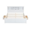 This storage platform bed is simple and fashionable. The headboard features several shelves, and there is a drawer on each side of the bed for your storage. White or antique wood finish will fit any room style. The built-in 2 Standard Plug Outlets & 2 USB Ports are easy for charging of mobile phones.