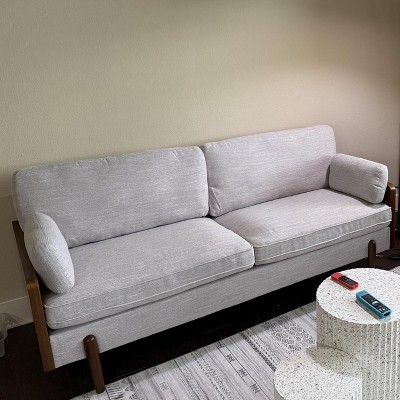 Add a touch of mid-century modern charm to your home with this beautifully designed sofa. Featuring sleek wooden sides and rounded legs, this piece embodies the true essence of mid-century style. With extra plush cushioning on both the seat and back, it offers superior comfort for lounging or entertaining. The slim track arms not only enhance the modern aesthetic but also maximize seating space, making it perfect for cozy movie nights with family and friends. A perfect blend of style and comfort, this sofa will elevate any living space with timeless appeal.