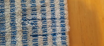 Some white loops were pulled when package arrived. I trimmed the very long pulled loops, the blue lines you see in the second picture are where the white loops had pulled. This set was a gift. Could you send me replacments - a different style without the big loops.