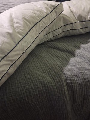 These two pillows fluff up nicely with some work and look good on my guest bed. I need good neck support while I sleep, and unfortunately, I don’t feel like goose feather pillows provide that. My head quickly sinks down on these and lands on a firm surface of feathers. My husband, however, could sleep comfortably on these on his side or on his stomach.
