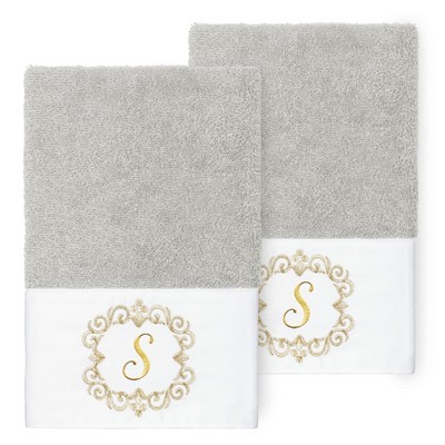 The Monica Embellished Towel Collection features an elegant metallic crest motif with your monogram embroidered on a crisp white border. These soft and luxurious towels are made of 100% premium Turkish Cotton and offer lasting absorbency and superior durability.