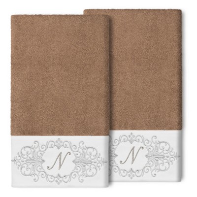 • A: The towel features an elegant metallic crest motif and allows for personalized monogram embroidery.