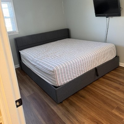 I love this bed. Incredibly sturdy, I have a heavy king, 14in mattress on top and have no issue opening and closing the storage space. Love the look of the headboard.