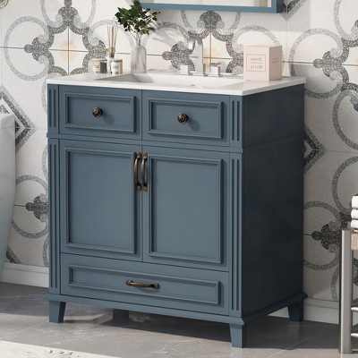 30" Retro Style Bathroom Vanity with Ceramic Sink, Solid Wood Frame Cabinet with 2 Soft-Close Doors & 1 Drawer, Blue/Green/White - ModernLuxe