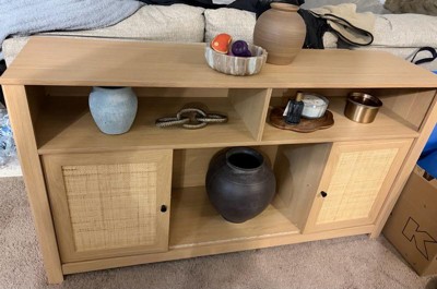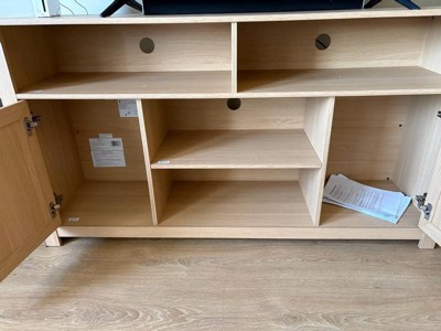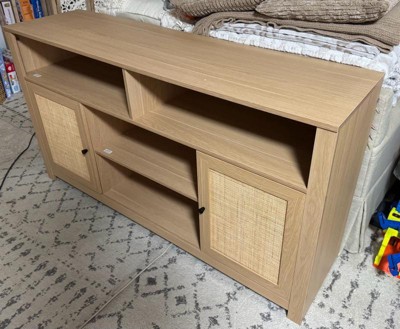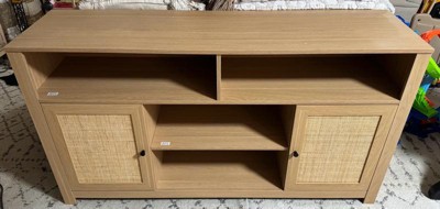Form and function pair beautifully in this mid-century modern buffet sideboard that is ideal for use as a TV stand. Two doors with rattan accents reveal generous storage compartments paired with 4 shelves that accommodate up to 22 lbs. each. Crafted from sleek engineered wood and boasting 4 cable management ports, this entertainment center blends seamlessly in any room. Plastic floor glides protect your hard flooring surfaces for worry-free movement.